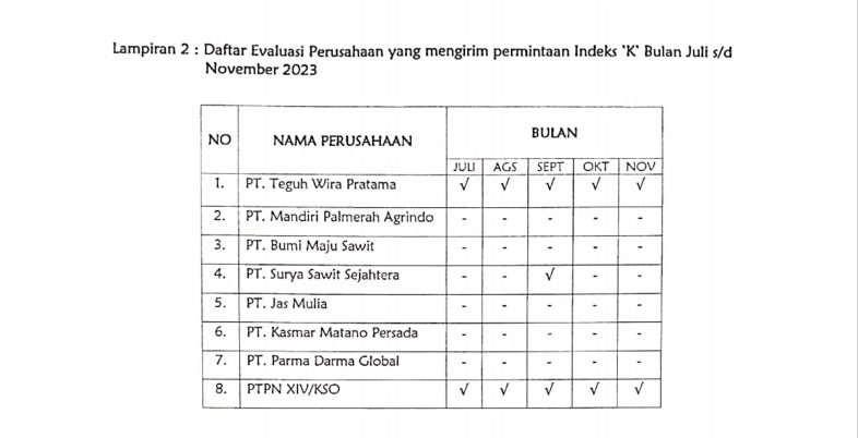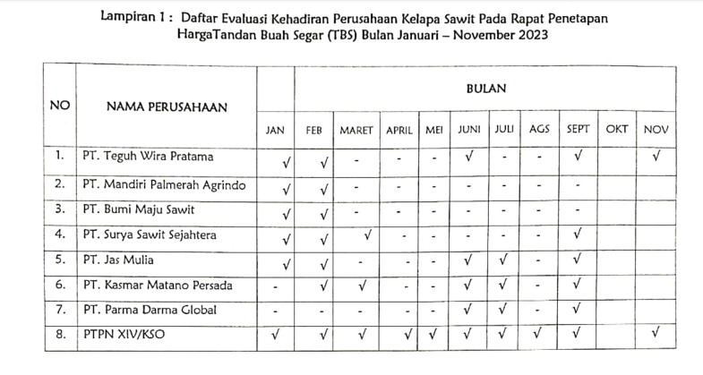 Utusan perusahaan yang diminta datang dan membawa hitung-hitungan 'Indeks K' untuk kepentingan rapat penetapan harga Tandan Buah Segar (TBS), tak datang semua.