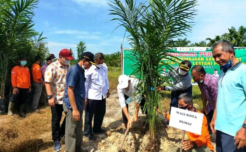 Wali Kota Dumai, Paisal, ditemani Ketua DPW Apkasindo Riau, KH. Suher saat melakukan penanaman perdana PSR milik Poktan Teras Lestari di kelurahan Basilam Baru, Kecamatan Sungai Sembilan, Minggu (13/6