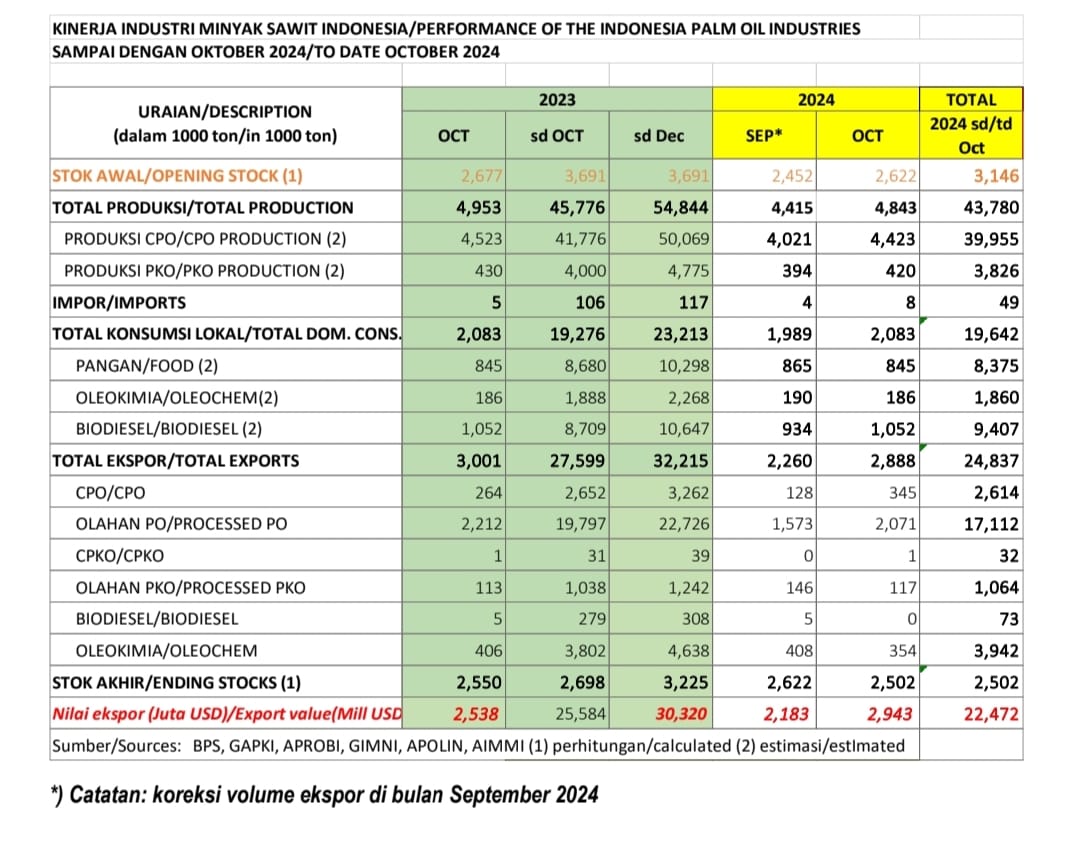 Namun kenaikan lumayan di bulan Oktober ini belum cukup mampu untuk mendorong peningkatan produksi secara YoY dibanding tahun sebelumnya. Faktanya, sampai dengan Oktober, produksi CPO dan PKO tahun 2024 hanya 43,780 juta ton, atau 4,56% lebih rendah dari periode yang sama tahun 2023, yaitu sebesar 45,776 juta ton.