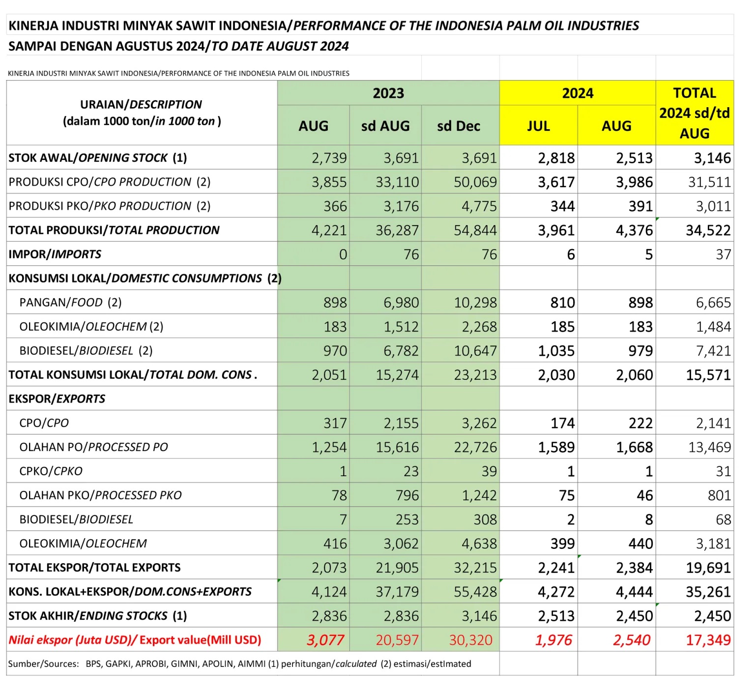 Sementara itu, produksi CPO bulan Agustus 2024 mencapai 3,986 juta ton, naik 10,2% dibanding bulan sebelumnya sebesar 3,617 juta ton. Demikian juga dengan produksi PKO naik menjadi 391.000 ton dibanding bulan sebelumnya sebesar 344.000 ton.