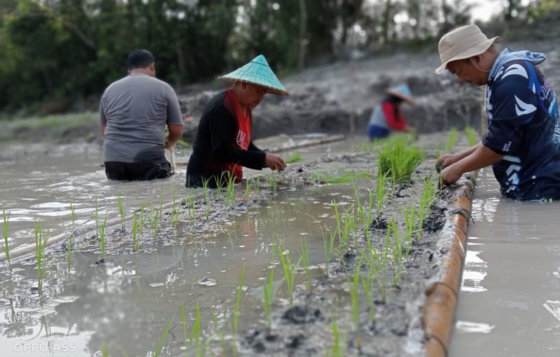 Para petani sedang menanam padi dengan metode sawah apung. foto: dok. smm