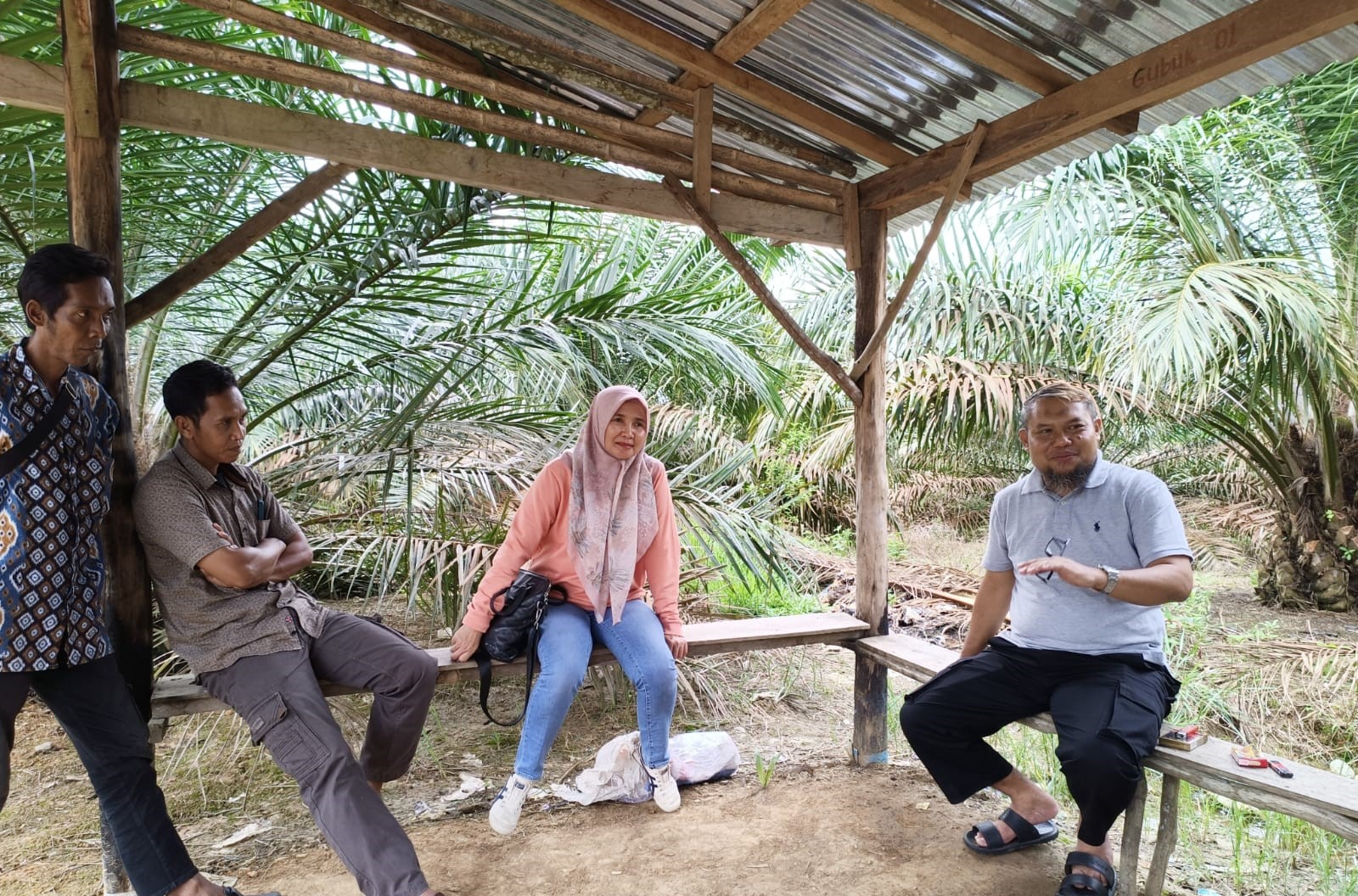 Ketua Koperasi Mukti Jaya, Bambang Gianto, saat berbincang di kebun sawit mereka. foto: dok. pribadi.