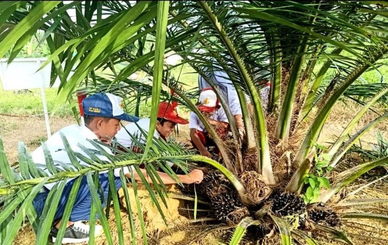 Anak-anak sekolah di Riau nampak ceria menengok tanaman kelapa sawit orang tuanya. Foto: Ist